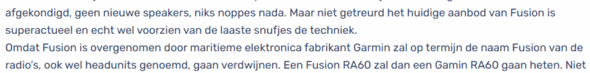 Omdat Fusion is overgenomen door maritieme elektronica fabrikant Garmin zal op termijn de naam Fusion van de radio’s, ook wel headunits genoemd, gaan verdwijnen. Een Fusion RA60 zal dan een Gamin RA60 gaan heten. Niet helemaal helder op dit moment is of de speakers van Fusion die perfect aansluiten bij de Fusion radio’s straks ook Garmin gaan heten.